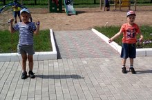Мы скакать не устаём.Посмотрите!Вот как учимся прыгать на скакалке. -