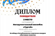 Инструментальный ансамбль "Тургай" участвовал в Республиканском творческом конкурсе "Фестиваль талантов" в номинации: "Музыкальное творчество" и получил диплом 2 степени.