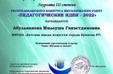 Преподаватель ДШИ теоретических дисциплин Абульханова Милеуша Гаязетдиновна приняла участие в Республиканском конкурсе методических работ "Педагогические идеи - 2022" и удостоилась Диплама Лауреата III степени в номинации "Презентация к уроку" по теме "Музыка в сказке". Поздравляем!