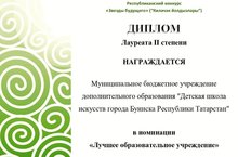 Муниципальное бюджетное учреждение дополнительного образования "Детская школа искусств города Буинска Республики Татарстан" приняло участие в Республиканском конкурсе "Звёзды будущего" - "Килэчэк йолдызлары". В номинации "Лучшее образовательное учреждение" школа награждена Дипломом Лауреата II степени. Мы - молодцы!