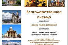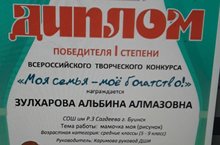Зулхарова Альбина, воспитанница Каримовой Альбины Курбангалиевны - стала ПОБЕДИТЕЛЕМ I степени во Всероссийском творческом конкурсе "Моя семья - моё богатство!"