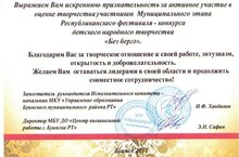 Руководитель Каримова Альбина Кубангалиевна получила Благодарственное письмо от организаторов конкурса.