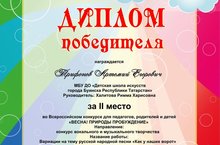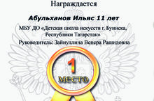 Трифонов Артемий, ученик 1 класса, педагог- Халитова Р. Х. участвовал во Всероссийском конкурсе "Весна!Природы пробуждение" и занял II место. Название работы: вариации на тему русская народная песня "Как у наших у ворот". Поздрвляем!