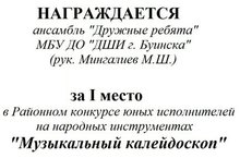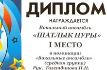 Ансамбль "Дружные ребята" заняли I место, Ахметзянов Инсаф - II место. Руководитель- Мингалиев М.Ш. Поздравляем ребят и желаем дальнейших успехов!