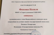 Награждается Феизова Назиля обучающаяся 8 класса победитель муниципального этапа Всероссийского конкурса среди юнармейцев на лучшее знание государственной символики России и Татарстана. Номинация: "Государственная символика РТ". Руководитель: Савельев А.Е. Молодцы!