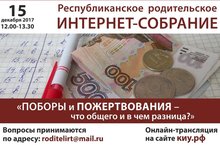 Департамент надзора и контроля в сфере образования совместно с Казанским инновационным университетом имени В.Г.Тимирясова (ИЭУП) планирует провести 15 декабря 2017 года Республиканское родительское интернет – собрание по теме «Поборы и пожертвования – что общего и в чем различия?».