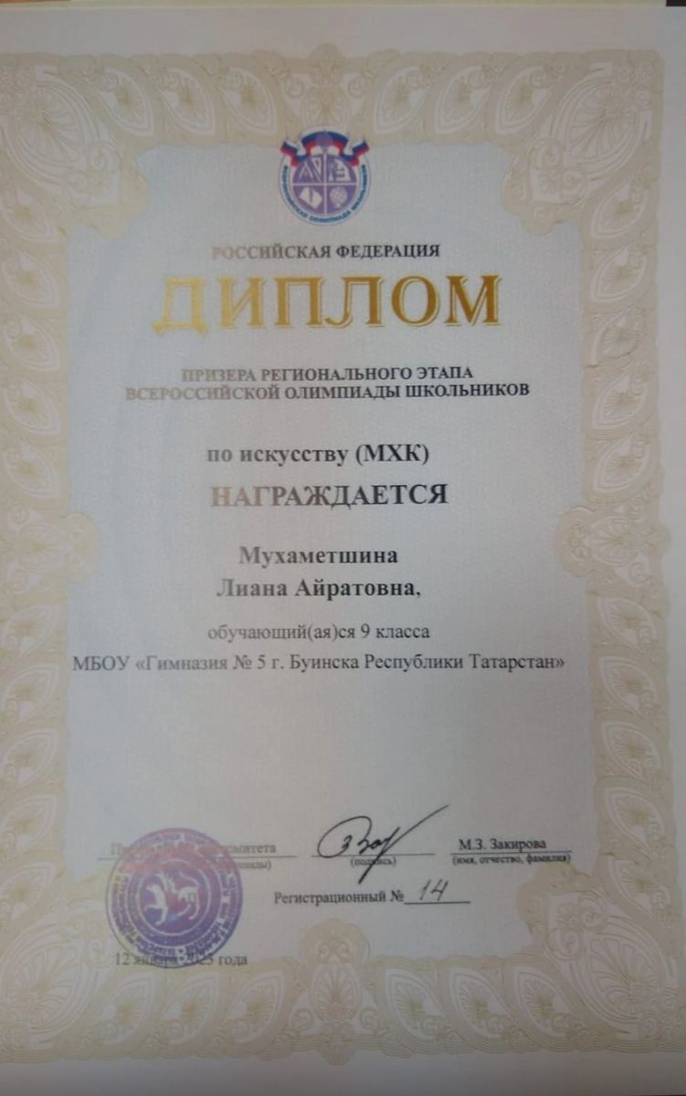 Поздравляем Мухаметшину Лиану, ученицу 9-а класса, призёра регионального этапа всероссийской олимпиады школьников по искусству (МХК)