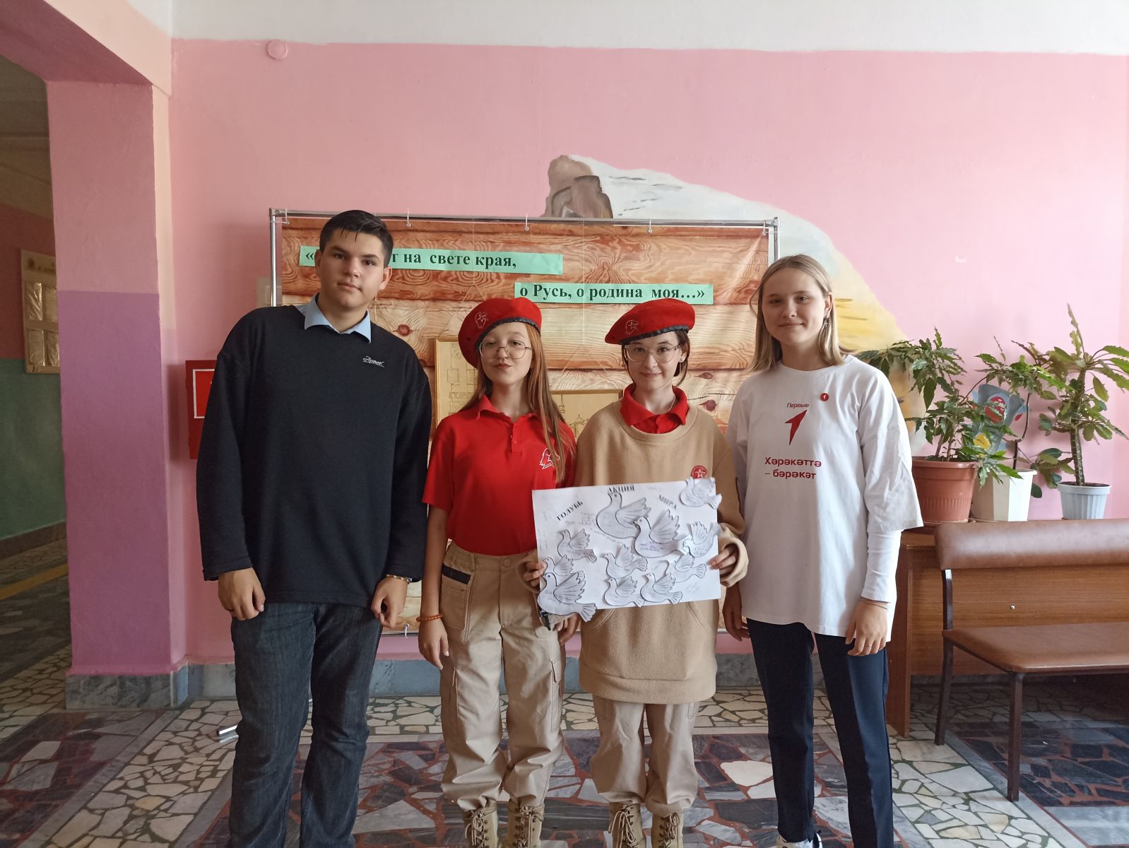 Опубликовано: 19.09.202319.09.2023 активисты Движения Первых, юнармейцы и ШУС провели акцию "Голубь мира", приуроченная к Всемирному дню Мира. Данная акция показала, насколько важен мир для всей планеты, как все мы не хотим войны и будем беречь мир ради себя и ради будущих поколений.