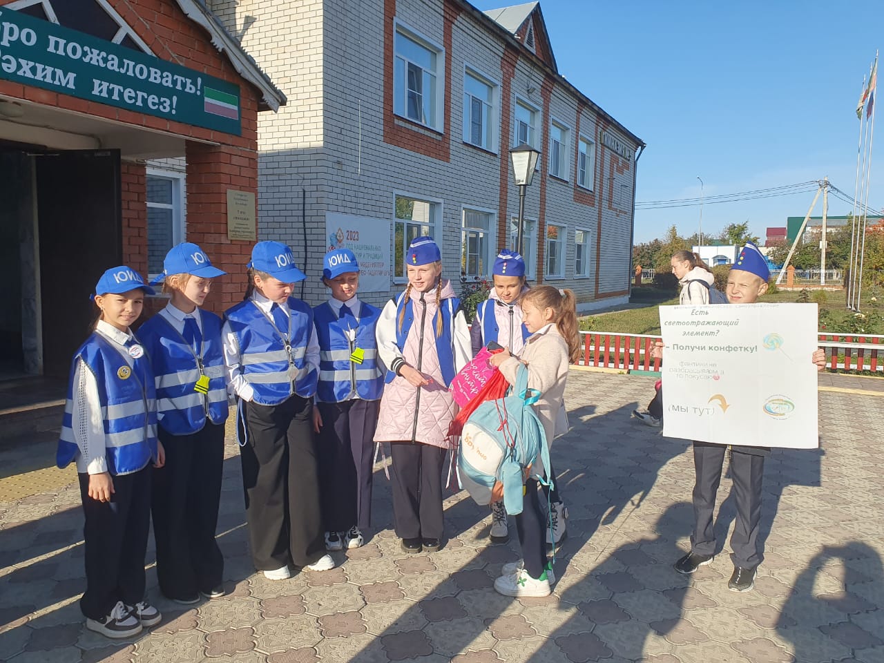 С утра дети встретили учителей и учащихся и за наличие световозвращающего элемента давали конфетки.
