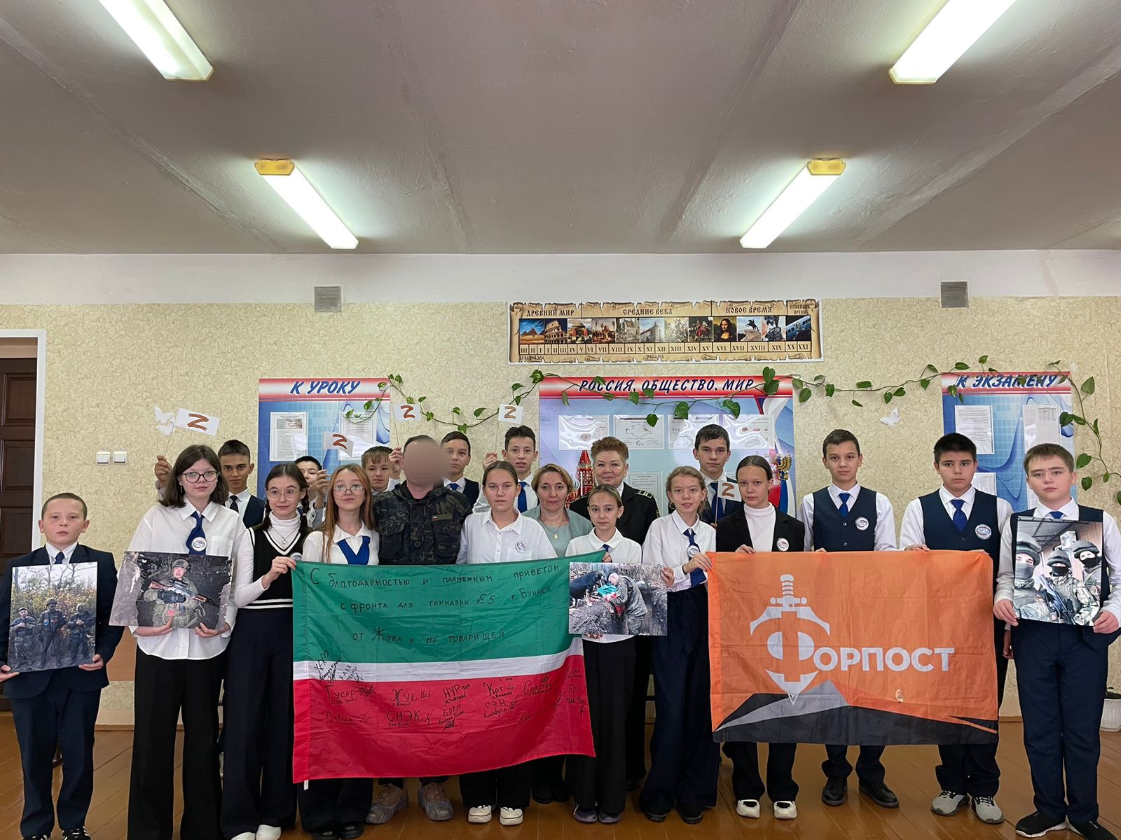Опубликовано: 27.10.2023Сегодня в МБОУ "Гимназия/5 г.Буинска РТ" прошла классная встреча с участником специальной военной операции на Украине. С этим парнем обучающиеся 7а класса познакомились на встрече в апреле этого года. С тех пор гимназисты поддерживают с ним постоянную связь,пишут мобилизованным на фронт письма,отправляют им обереги.
