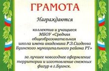 31 декабря на праздничном новогоднем мероприятии наша школа была награждена Почетной грамотой за лучшее новогоднее оформление территории школы.