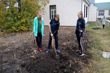 Выпускники 9, 11 классов на пришкольном участке посадили яблони. -