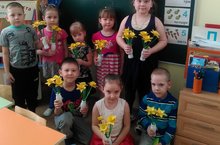 Әниләр өчен балалар кисеп-ябыштыру шөгылендә үз куллары белән нарцис чәчәге ясадылар. Кич әниләр, әбиләр, апалар килгәч бүләкләрен аларга тапшырдылар.