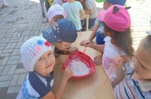 Сегодня у детей старшей группы прошел праздник «Мыльных пузырей». Воспитатели провели много конкурсов с мыльными пузырями, провели эстафету, делали мыльные пузыри с помощью трубочек.