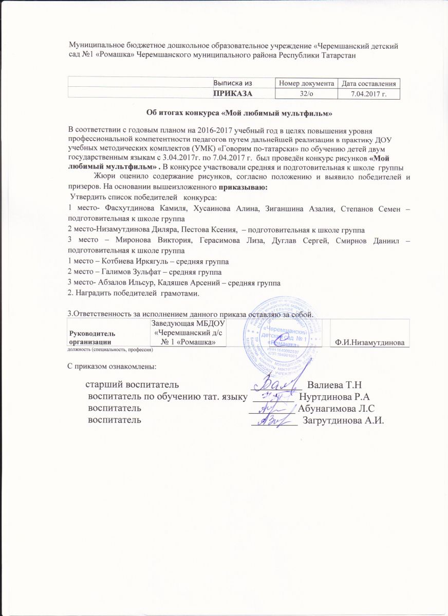 Опубликовано: 07.04.2017Приказ об итогах конкурса "Мой любимый мультфильм"