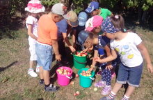 "Чишмәкәй" балалар бакчасында күп төрле алмагачлар үсә. Җәй көне алар тәмле итеп кызарып пешәләр. Бүген балалар тәрбиячеләр ярдәме белән бакчадан алмалар җыеп керделәр. Балалар алмаларны бик яраталар, шуңа еш кына чиләккә җыйган алмаларны пешекчеләргә компот яисә тәмле кыстырма пешерер өчен кертеп бирәләр. Пешекчеләр исә үз чиратында балаларны төшке аш вакытында алмадан пешергән әйберләре белән сыйлыйлар.