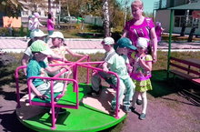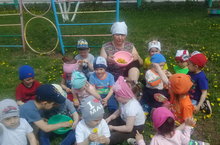 Менә көтеп алган җәй дә килеп җитте. Без күп вакытыбызны урамда - саф һавада үткәрәбез. Безгә бергәләп уйнавы бик рәхәт. Чөнки, бакчабызда бик күп яңа атынгычлар, әйләнгечләр, ком савытлары, таулар бар. Безгә бу яңа уенчыклар бик ошый. Рәхмәт апаларга!
