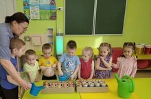 Посадка лука в землю на подоконнике в детском саду.