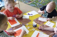 Для аппликации были подготовлены картонные заготовки различных цветов, клей, ножницы и цветная бумага. Воспитатель показала пример готового скворечника и объяснила последовательность выполнения работы.