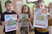 По традиции в первый день масленичной недели наши предки мастерили из соломы и старых вещей чучело, сооружали горки и снежные крепости, хозяюшки принимались печь блины. Первым блином обязательно угощали нищих или малоимущих. Остальными блинчиками следовало накормить пришедших в гости родственников, а за едой обсудить готовящееся празднование Масленицы. Ребятишки разновозрастной группы детского сада «Солнышко» познакомились с традициями праздника, поиграли в настольные игры и нарисовали картины с широкой масленицей. -