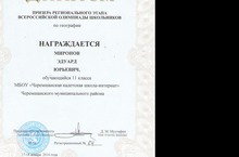 Учащийся 11 класса Миронов Эдуард на муниципальном этапе по географии, занял 1 место и по результатам был направлен на Региональный этап. с 16-19 января 2014 года в г. Казани проводится Всероссийская олимпиада по географии. Учащиеся всей школы и учителя желают успехов и ждут от него результата.