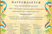 В районном этапе конкурса среди отрядов профилактики правонарушений общеобразовательных учреждений отряд профилактики правонарушений "Кадет" МБОУ "Кадетская школа -интернат" Черемшанского муниципального района РТ занял первое место.Поздравляем ребят с заслуженной победой.Молодцы!