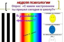 С 8 по 12 апреля в школе объявлена Неделя психологии. Такая форма психологической работы, как Неделя психологии, является новой для психологической службы в школеВо всей школе развешаны плакаты, афоризмы. В холлах, на этажах размещена информация об акциях и мероприятиях, оформлены стенды для педагогов, родителей и учащихся.Основными из видов работы являются психологические акции. Акции создают в школе определенный настрой, доминирующее эмоциональное состояние; школа становится единым целым, а находящиеся в ней люди — близкими и интересными собеседниками. -