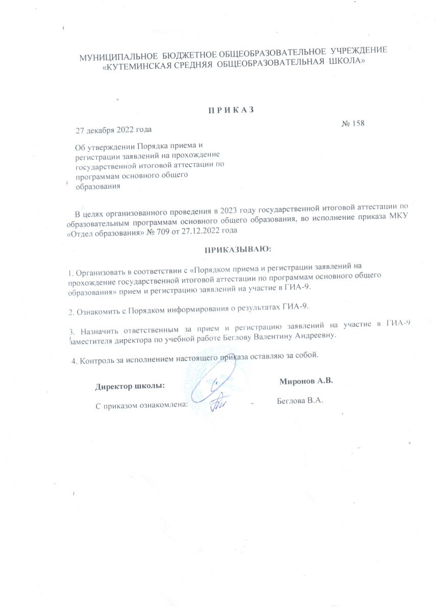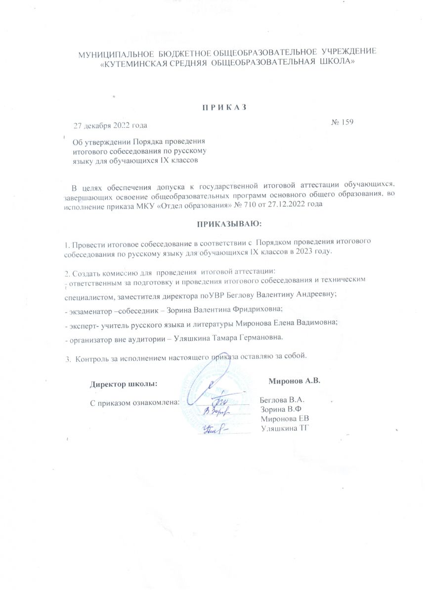 Приказ МБОУ "Кутеминская СОШ" №142 от 25 11.2022 г. "О проведении итогового сочинения ( изложения)"