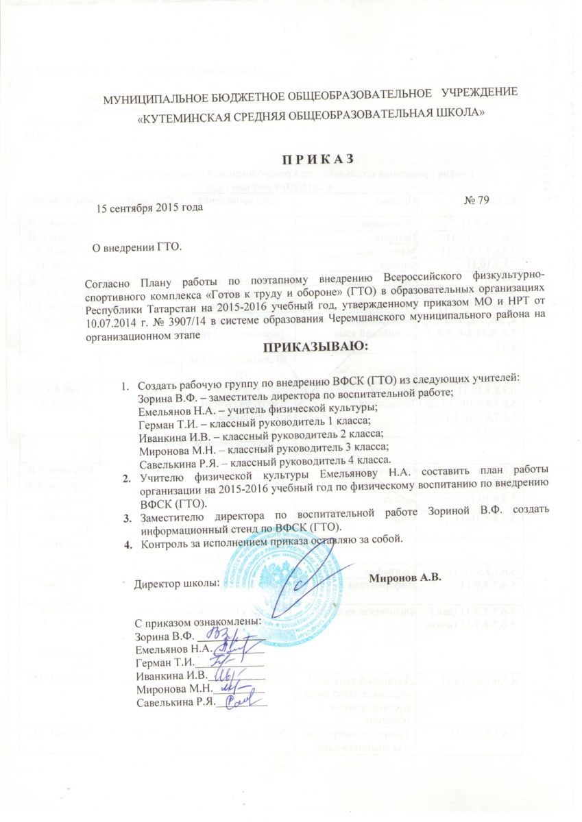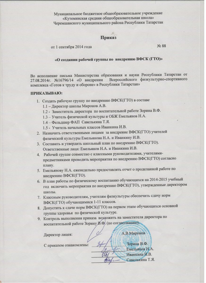 Приказ "О создании рабочей группы по внедрению ВФСК (ГТО)"