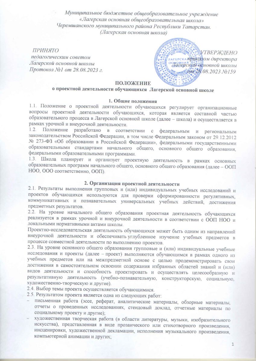 Положение о проектной деятельности учащихся в Лагерской основной школе