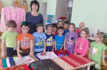 Тәрбияче Гөлия апалары зурлар төркемендәге балаларны татар халкының милли киемнәре ,чигү үрнәкләре белән таныштырды.