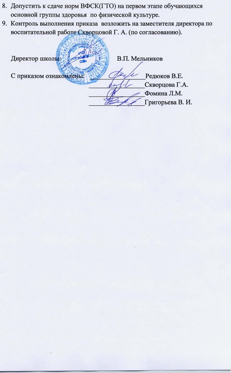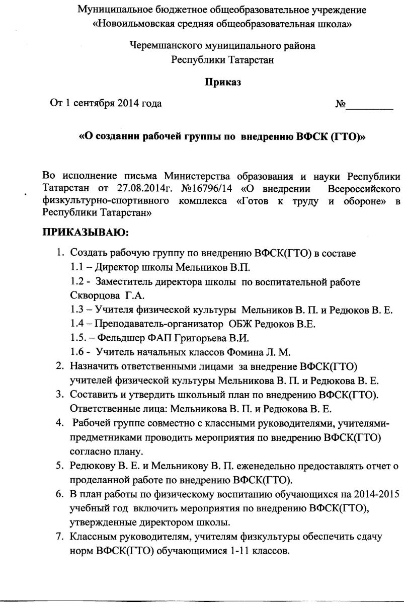Приказ о создании рабочей группы по внедрению ВФСК (ГТО)