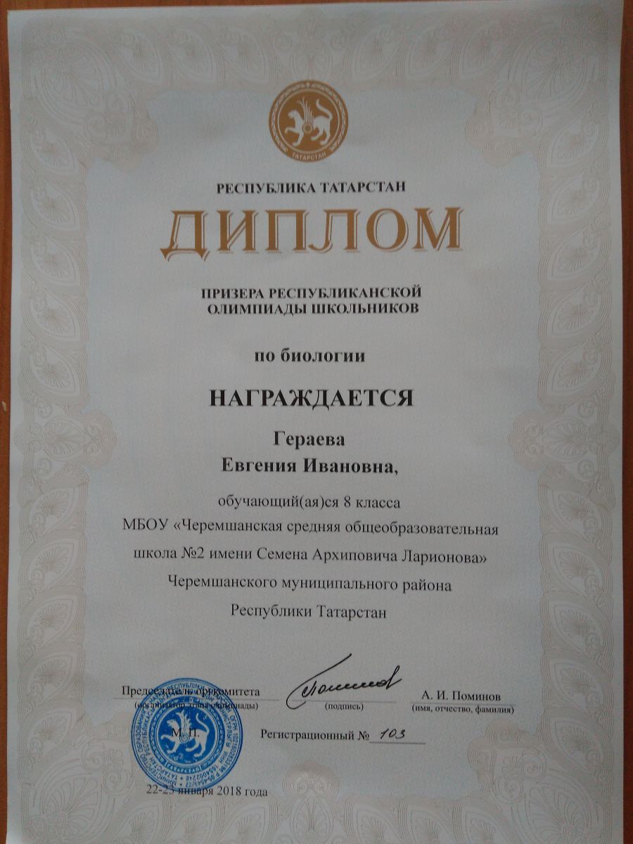 Гераева Евгения (8 класс) призер республиканской олимпиады школьников по биологии (руководитель Алеева Р.В.)