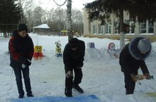 Ученики, вооружившись лопатами и лопатками, во главе с классными руководителями и учителями построили снежные фигуры на школьном дворе. -