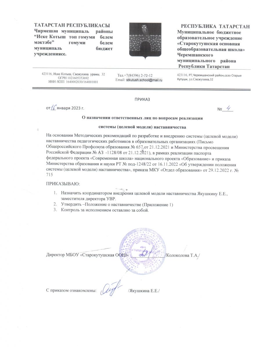 Приказ МБОУ "Старокутушская ООШ" от 16.01.2023 №4 "О назначении ответственных лиц по вопросам реализации системы (целевой модели) наставничества