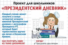 Каждый ученик сможет получить в конце четвертой четверти именной Президентский дневник с автографом Президента Республики Татарстан Рустама Минниханова, который будет торжественно вручён им лично в Казанском Кремле. -
