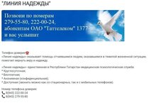 «Линия Надежды»— это бесплатная круглосуточная психологическая служба поддержки для жителей Татарстана и всей России. Она создана для того, чтобы помочь людям в трудную минуту.