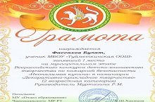 Ученик 5 класса Туйметкинской основной школы Фассахов Булат стал победителем по итогам муниципального этапа Всероссийского конкурса детско-юношеского творчества по пожарной безопасности "Неопалимая купина" в номинации "Декоративно-прикладное творчество" (руководитель Муртазина Р.М.).