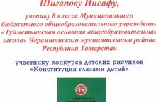 Ученик 8 класса Шигапов Инсаф Туйметкинской основной школы учится на отлично, активно участвует во всех внешкольных мероприятиях и во многих конкурсах.