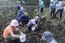 В школьном саду продолжаются осенние работы. Коллективными усилиями был собран урожай картофеля, срезали ветки кустов смородины. Все работали очень усердно.