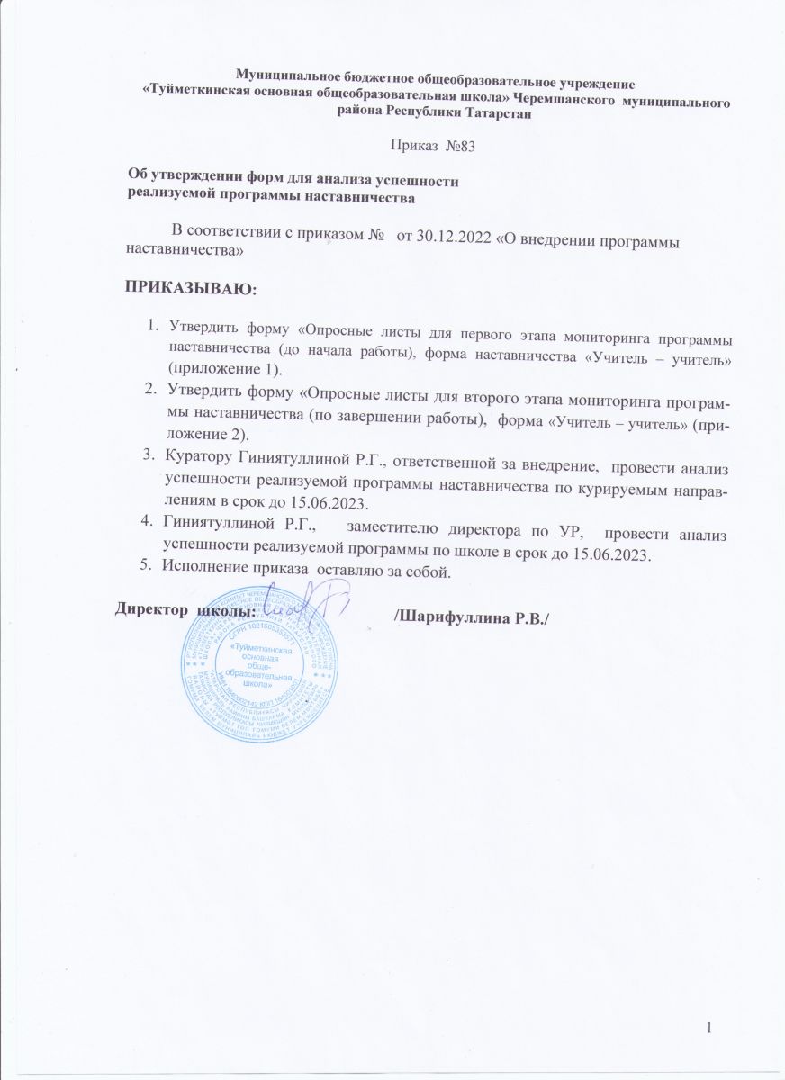 Приказ МБОУ "Туйметкинская ООШ" от 30.12.2022 №83 "О внедрении целевой модели наставничества"