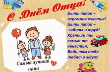 В слове «папа» заключается очень важный смысл, в нем много детских чувств. Для сыновей — это настоящий пример для подражания: смелый, сильный, всезнающий и все умеющий. Для дочки — защита и пример для выбора будущего мужа. Хотим поздравить наших пап праздником – Днем отца! Счастья Вам и здоровья! От наших детишек для вас небольшой подарок.