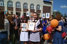 Бөек Җиңүнең 74 еллыгына багышлап район үзәгендә үткәрелгән тантаналы митингта һәм "Үлемсез полк" акциясендә катнашучы укучыларыбыз.