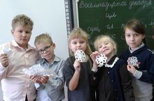 Ученики 1 класса вместе с ребятами из детского садика делали из бумаги новогоднего символа "Хрюшу".