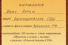 Поздравляем Ибах Артема, ученика 8 класса занявшего 3 место в сдаче норматива "Прыжок в длину с места" в рамках "Единой декады ГТО"