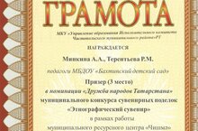 Иҗади педагогларыбызны "Этнографик сувенир" диеп исемләнгән сувенир эшләнмәләр муниципаль бәйгесе нәтиҗәләре белән котлыйбыз.