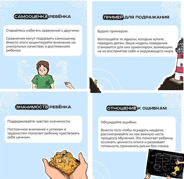 Важно, чтобы взрослые демонстрировали уважение к ребенку, признавали его успехи и поддерживали в моменты неудач, создавая безопасную и поддерживающую среду.
