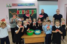 Сегодня,накануне Дня отца, советником директора по воспитанию и взаимодействию с детскими общественными объединениями Махортовой Р.В. и педагогом - организатором Дрок В.Д. был проведён " Арбузник".Почётными гостями на "Арбузнике" у первоклассников побывали папы!Да,папы тоже любят арбузы! На празднике гости узнали много интересного и нового о вкусной ягоде,повеселились,а главное - провели время с детьми,что так ценно в наше время!