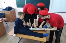 Юнармейцы в 4 классе провели занятие по оказанию первой медицинской помощи при переломах и вывихах, а также об использовании подручных материалов при наложении шин и повязок. На макете продемонстрировали выполнение непрямого массажа сердца.
