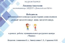 В муниципальном конкурсе для старших дошкольников "Юный экскурсовод" в рамках работы муниципального ресурсного центра "Чишмэ", наша воспитанница Леванова Анастасия стала победителем в номинации "Эколого-просветительская экскурсия". Поздравляем! Так держать!